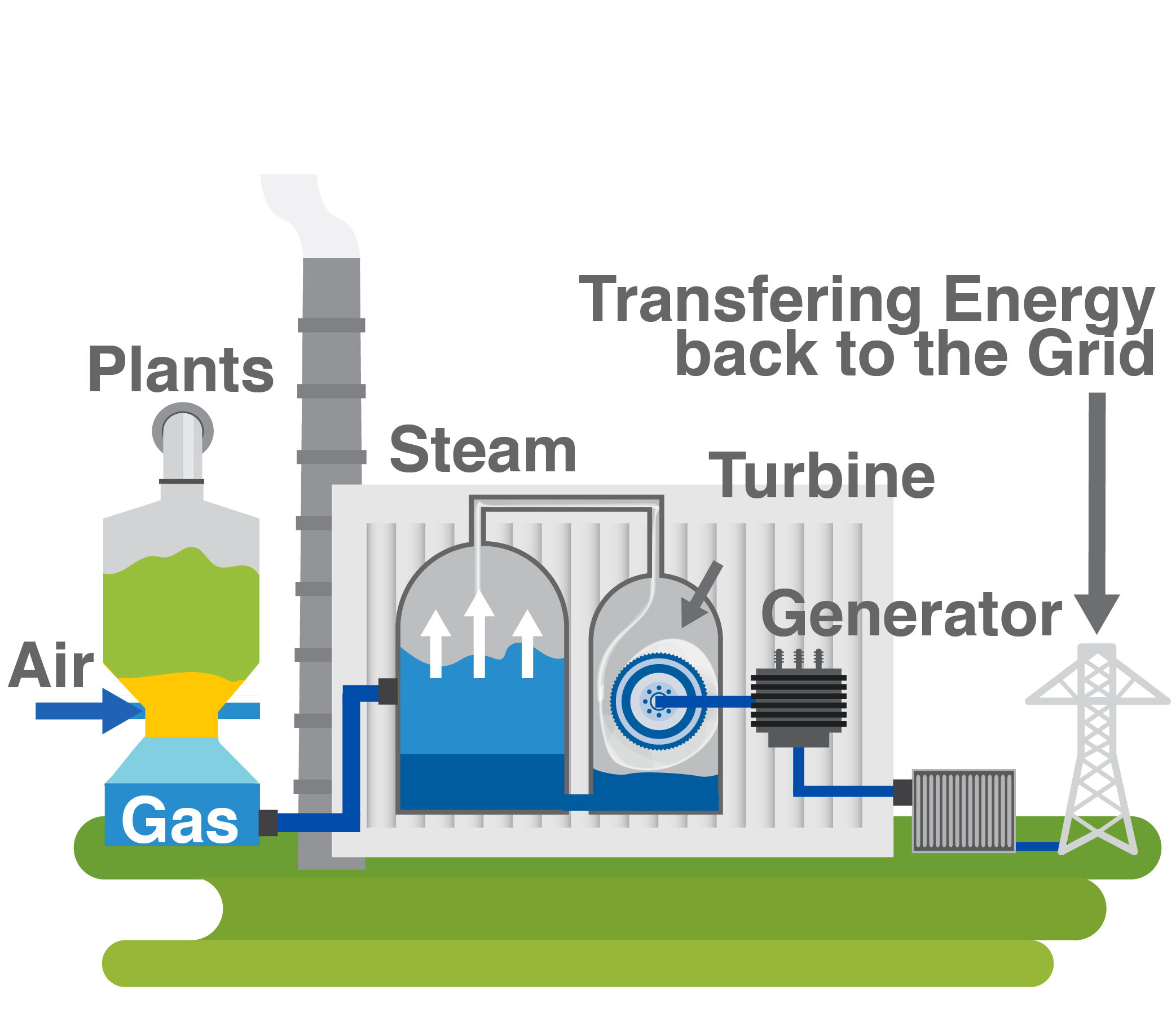 Organic materials are processed and burned to create steam to spin a turbine that generates electricity.
